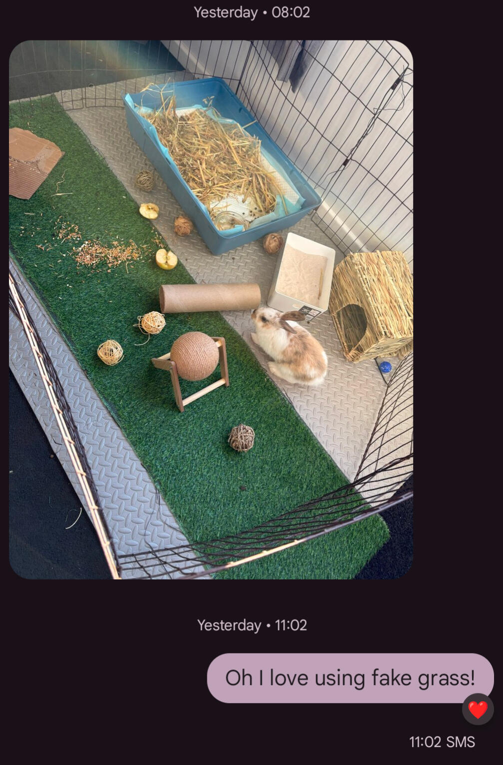 All our rabbits are kept inside on rabbit-specific flooring, such as carpet, sisal rug, and even cardboard for them to chew on. They each have their own housing, separated by 2 layers of metal fencing, and are litter trained with natural wood pellets.