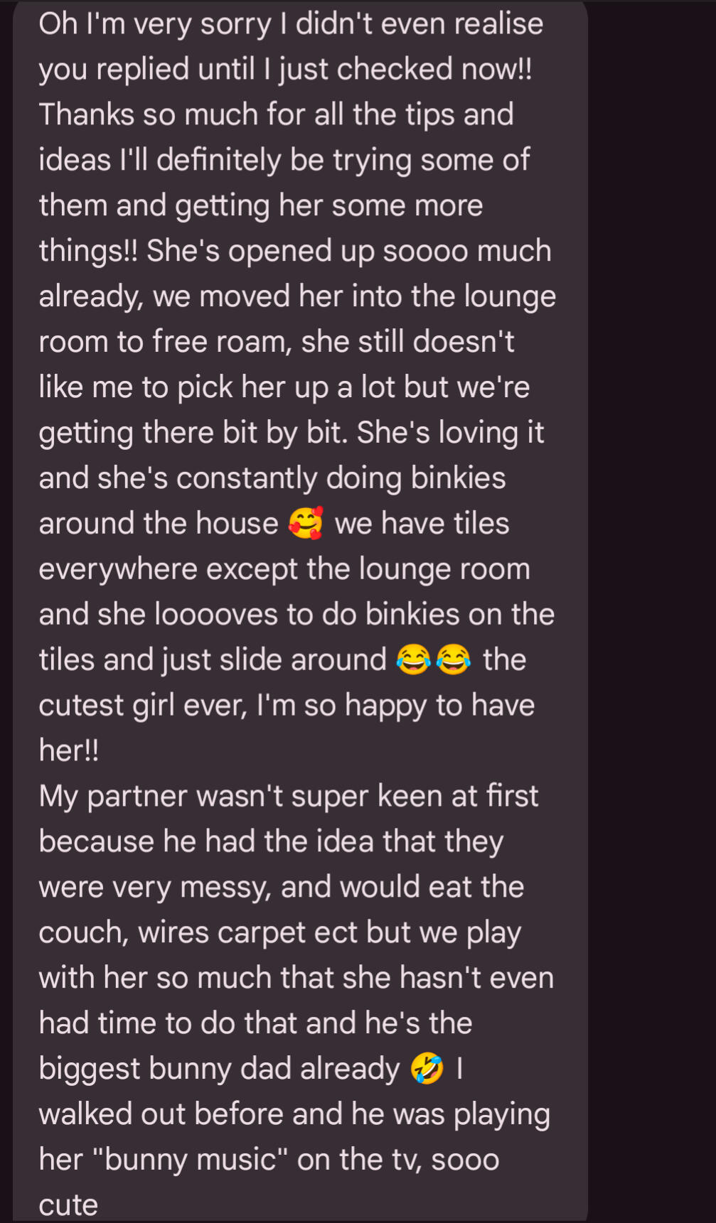 Another thing that sets us apart from other breeders is we WANT to stay in touch! We WANT to see pictures of your buns and how they grow and settle into their new homes!